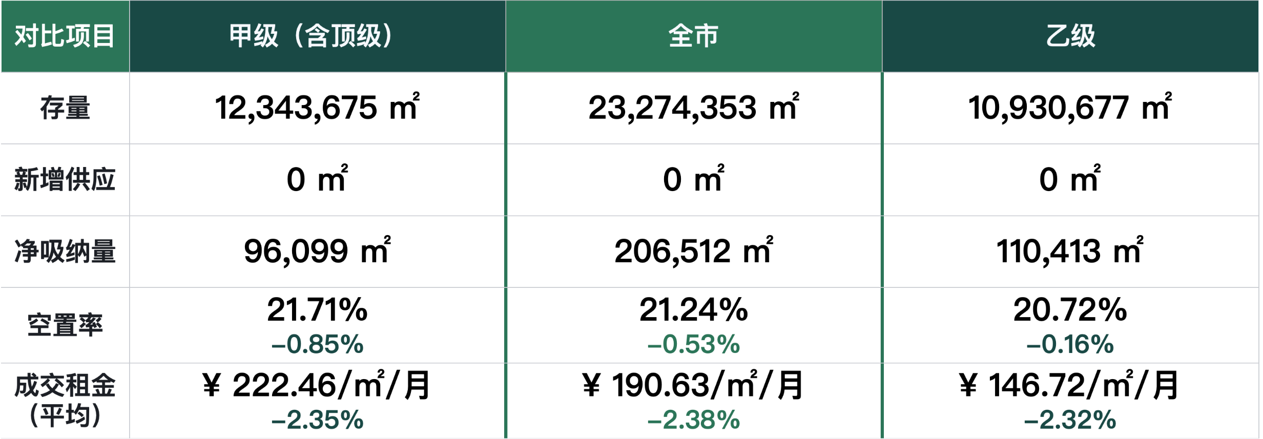 2025年第二季度各等級(jí)寫字樓成交租金繼續(xù)回落,全市平均成交租金由每月每平方米195元降低至191元;本季度暫無(wú)新項(xiàng)目入市,部分原計(jì)劃年內(nèi)入市的項(xiàng)目有所延期;全市各等級(jí)寫字樓空置率由升轉(zhuǎn)降,核心商圈甲級(jí)(含頂級(jí))寫字樓存量加速去化,空置率小幅降低;凈吸納量層面,各等級(jí)寫字樓均有上升,反映出企業(yè)擴(kuò)張信心增強(qiáng)。